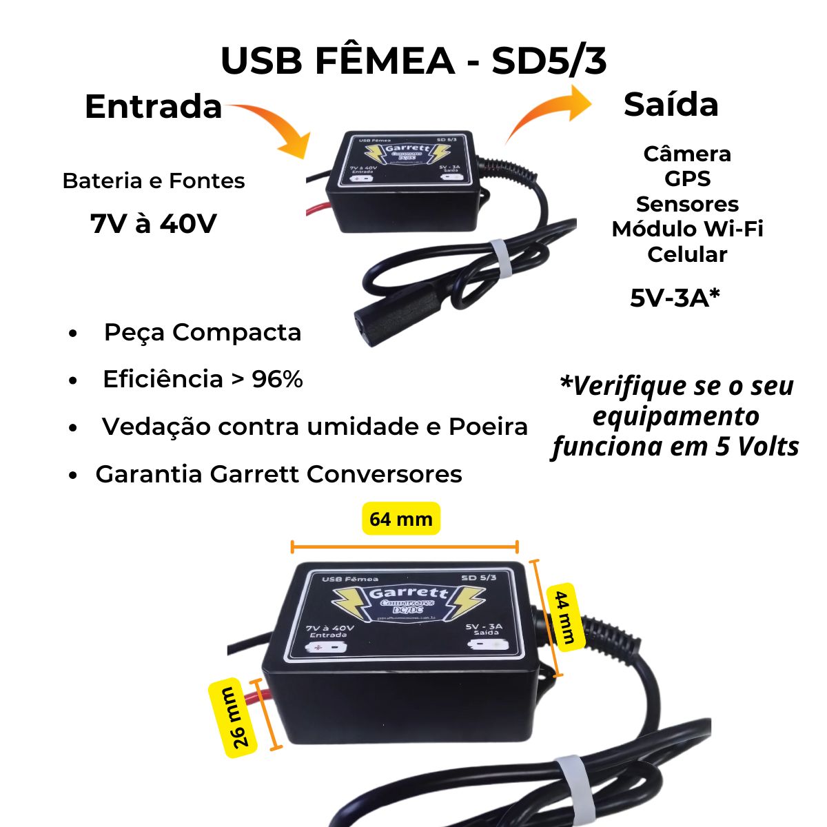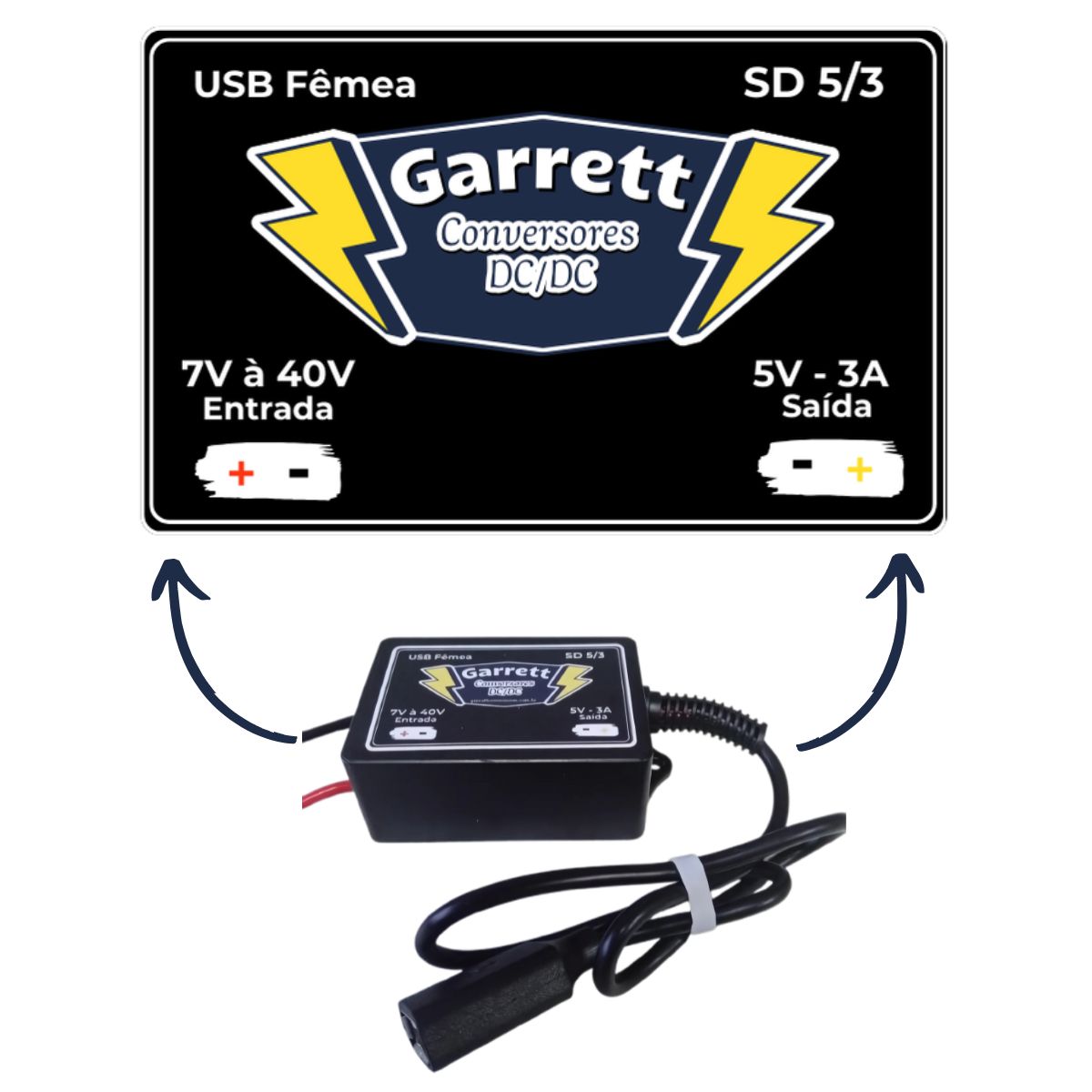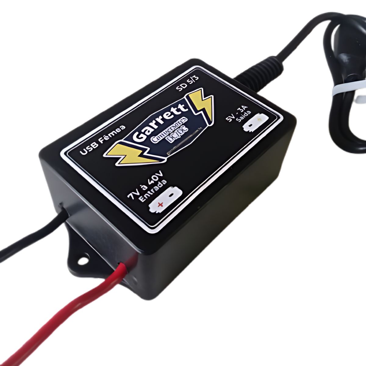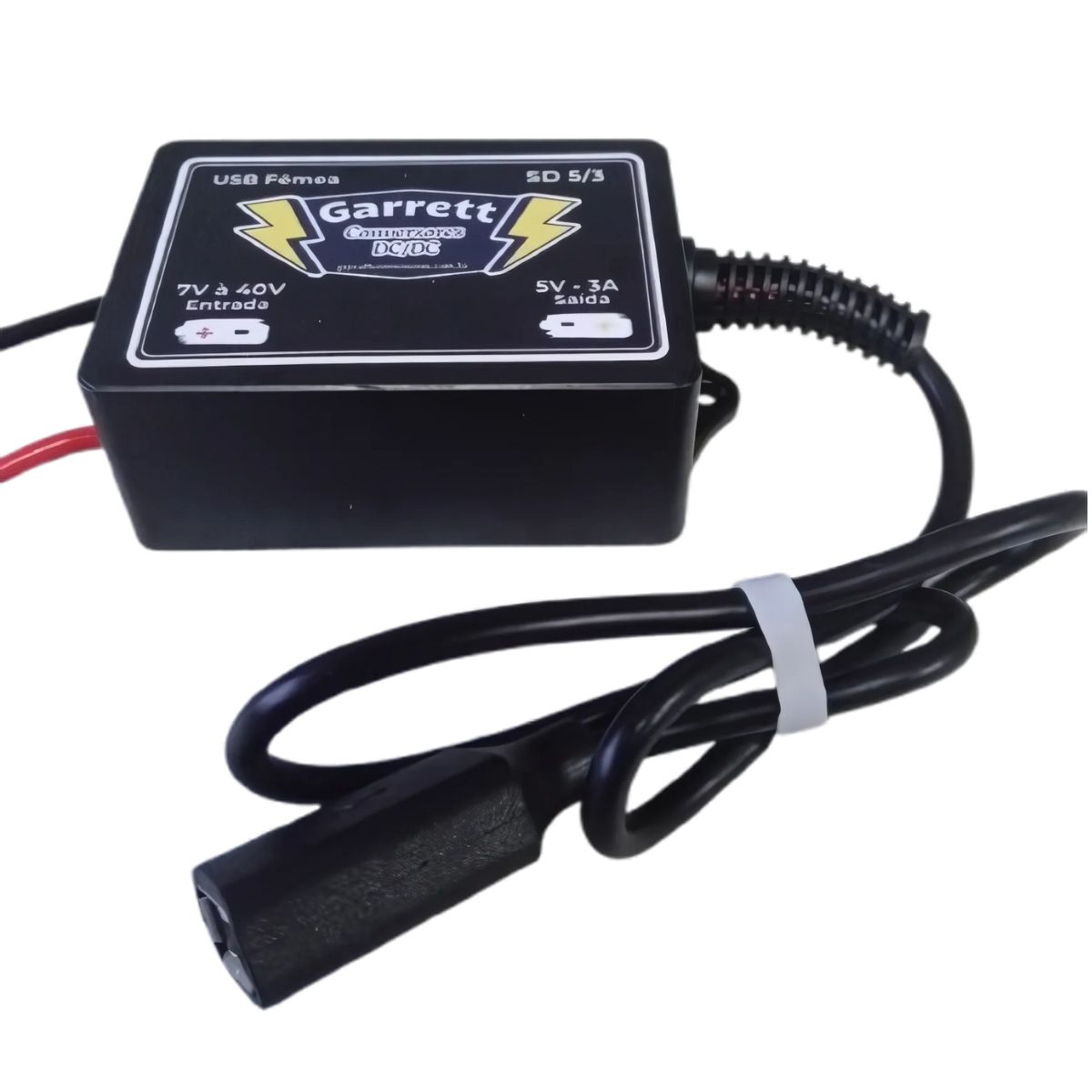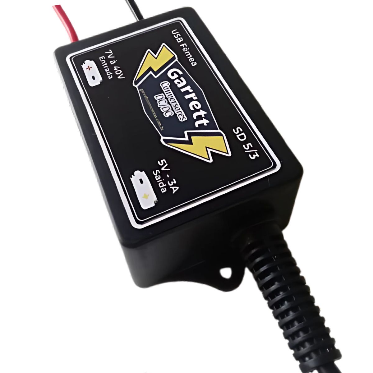O Conversor/Regulador de Tensão – USB Fêmea Garrett Conversores com entrada de 7V a 40V e saída de 5V 3A é um regulador de tensão step-down (buck converter) que reduz tensões mais altas para 5V e fornece energia por uma porta USB padrão fêmea.